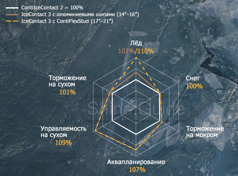 Шины Continental IC3 получили направленный дизайн, который улучшил поведение на мокрой поверхности и сухом асфальте, говорит технический специалист Shina.Guide, а применение двух типов шипов и оптимизированной схемы их размещения обусловило значительное улучшение сцепления модели со льдом, что в случае с обрезиненными шипами достигло 10%.